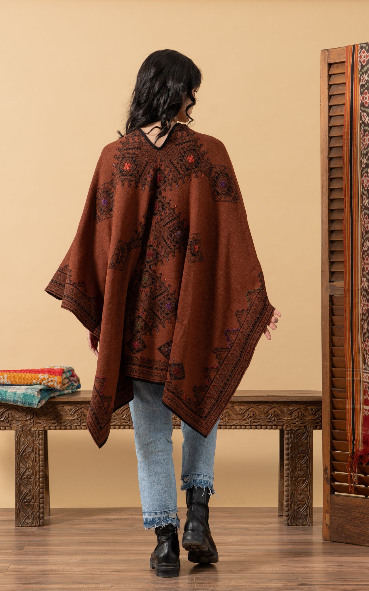 Our Nazca Ruana is hand loomed high in the Andes and features Pre-Columbian inspired geometric motifs. Each side is embellished with multi colored hand embroidery.