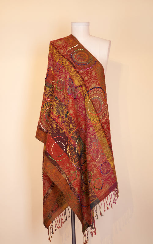 Boiled Wool Shawl, Embroidery, Crimson Patch