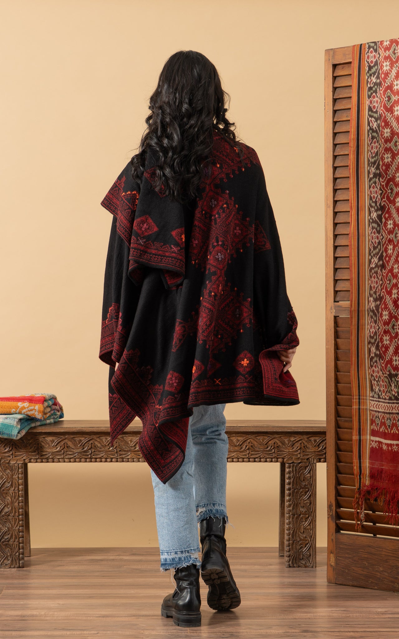 Our Nazca Ruana is hand loomed high in the Andes by Indigenous Quechua artisans and features Berber inspired geometric motifs. Each side is embellished with multi colored hand embroidery and is reversible.