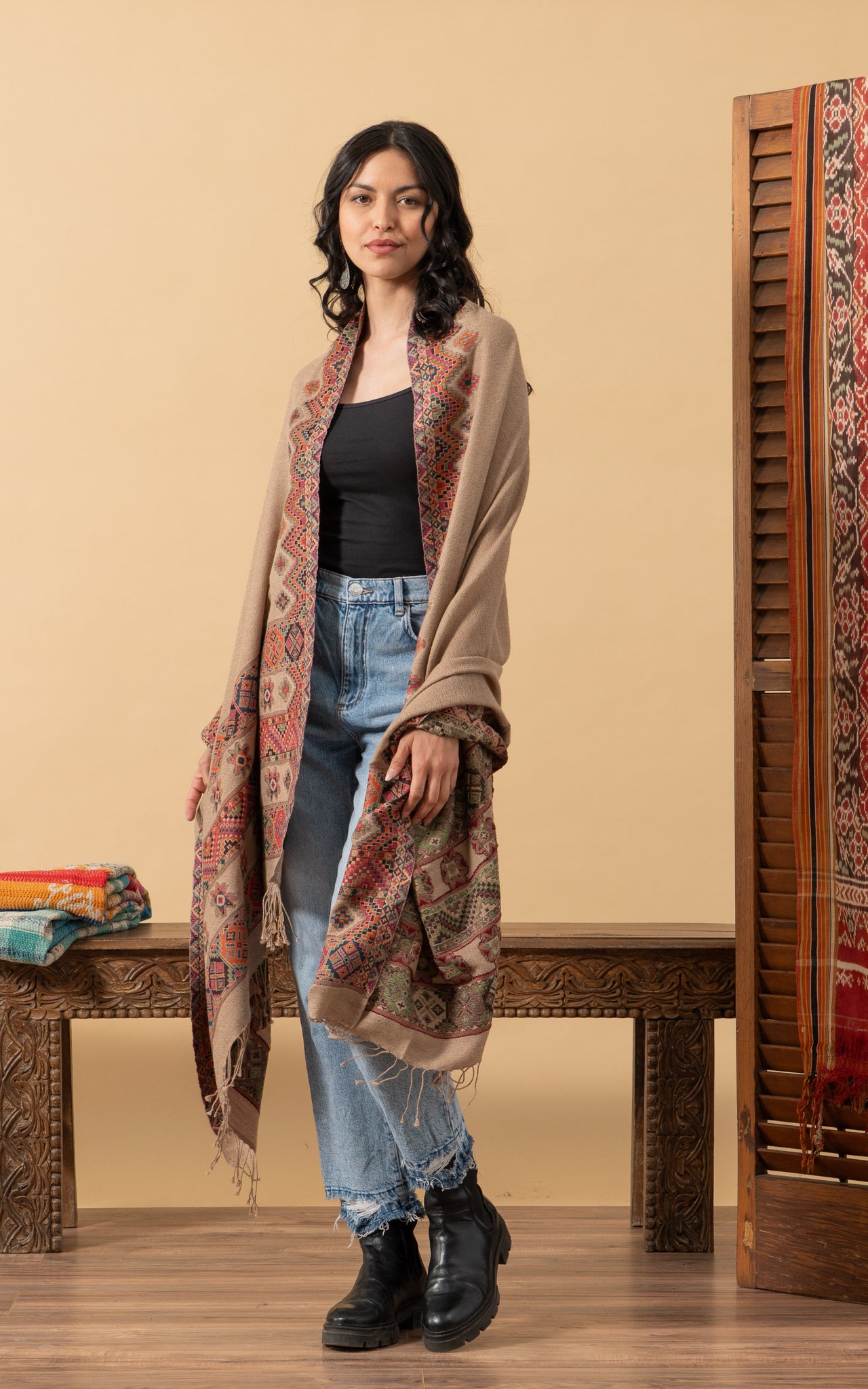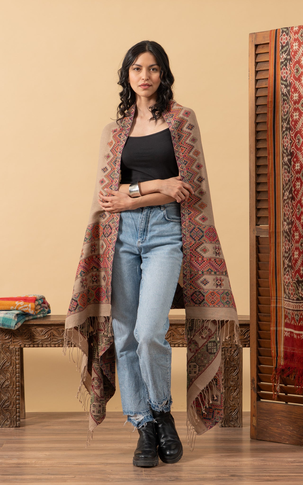 Tribal Shawl, Large, Beige Ethnic